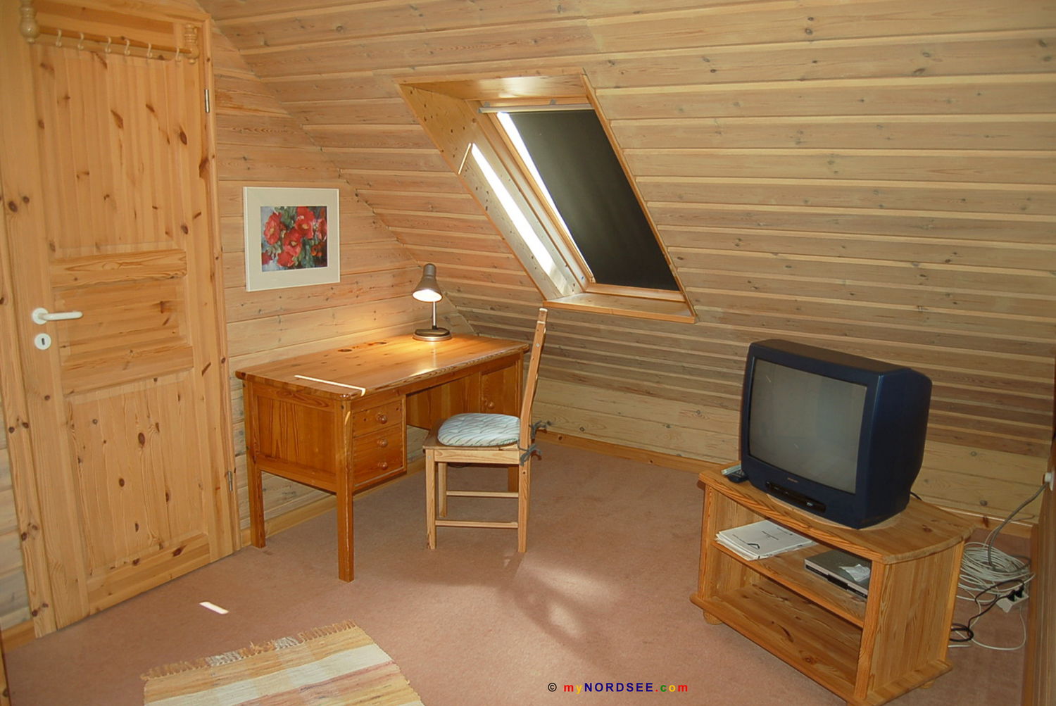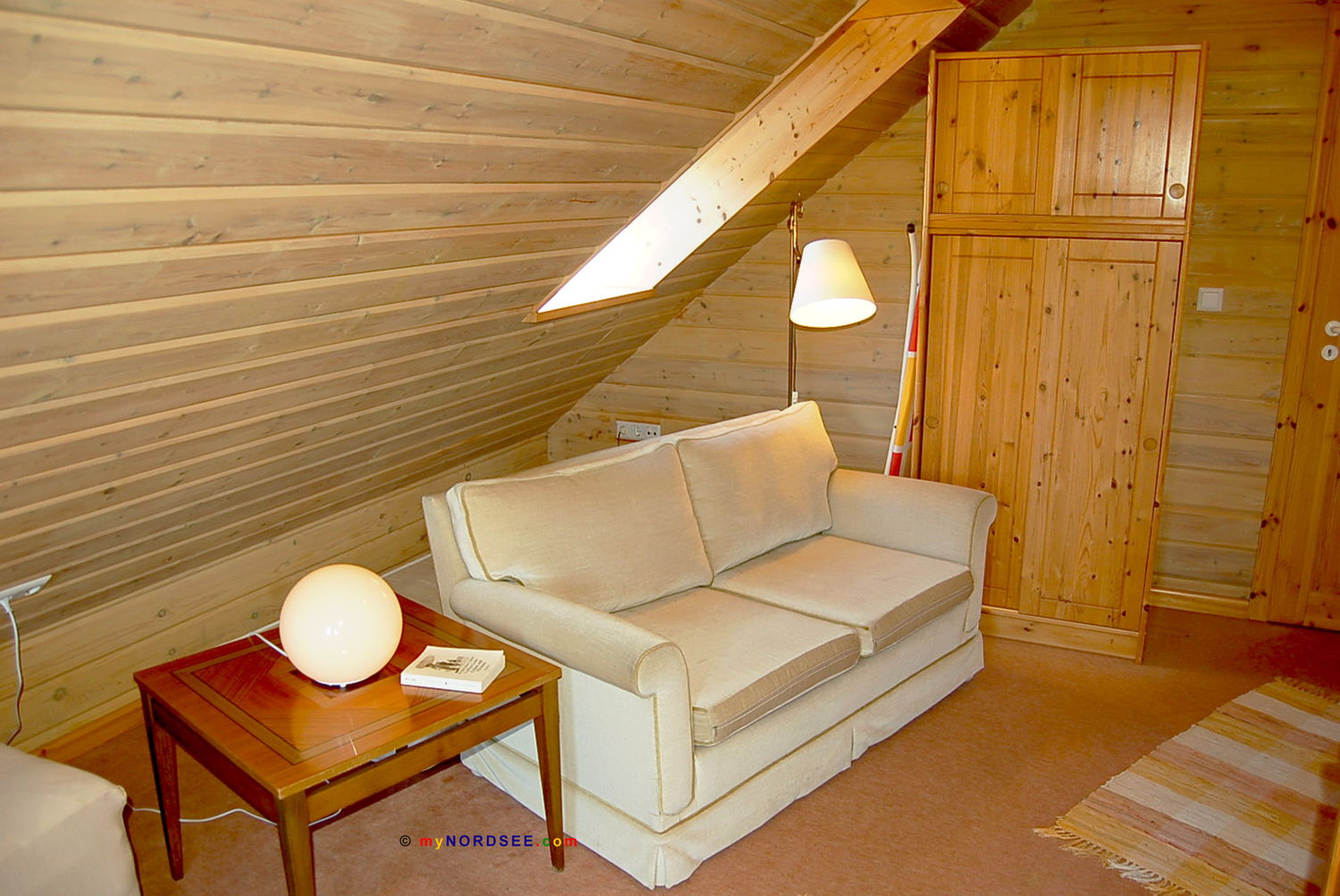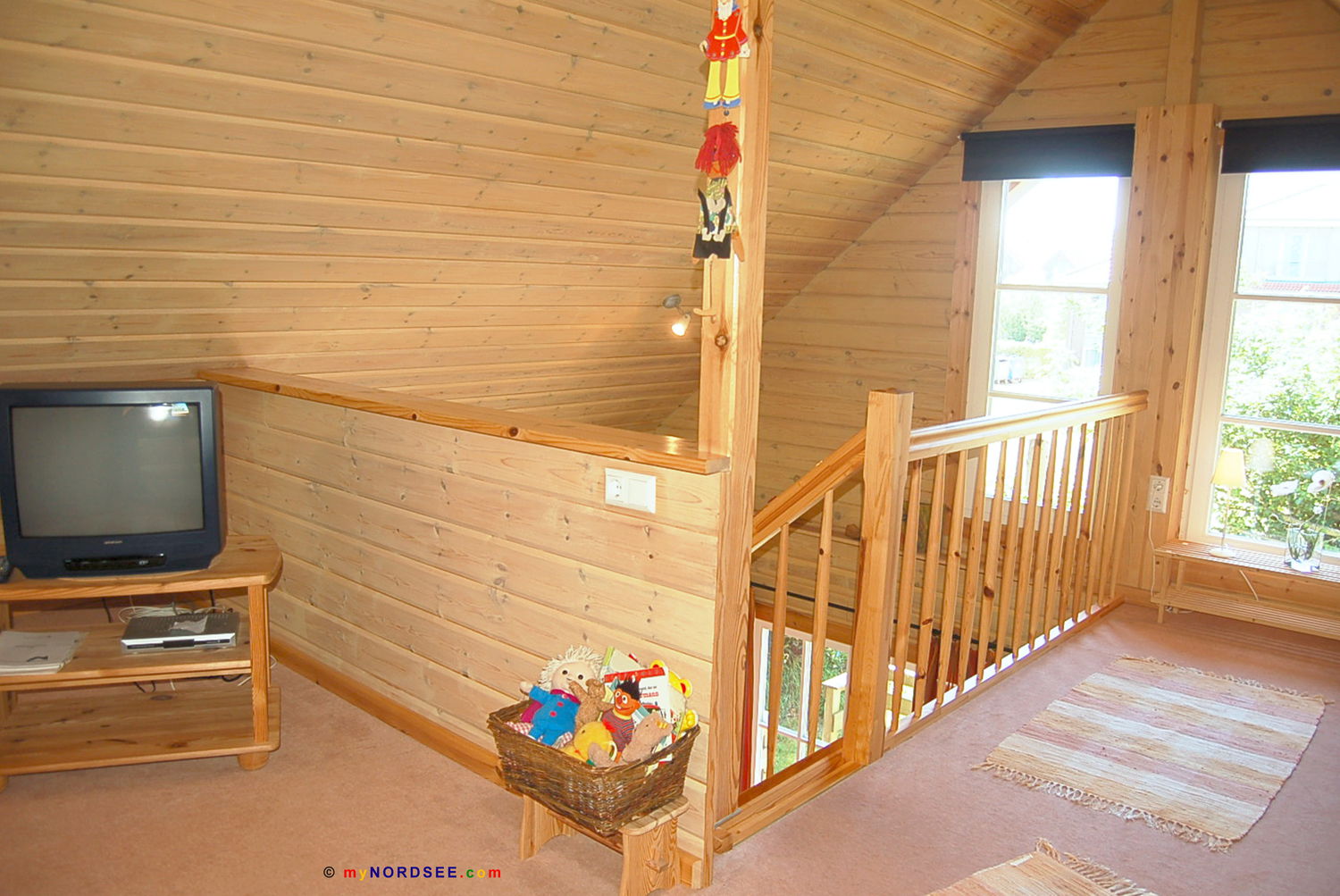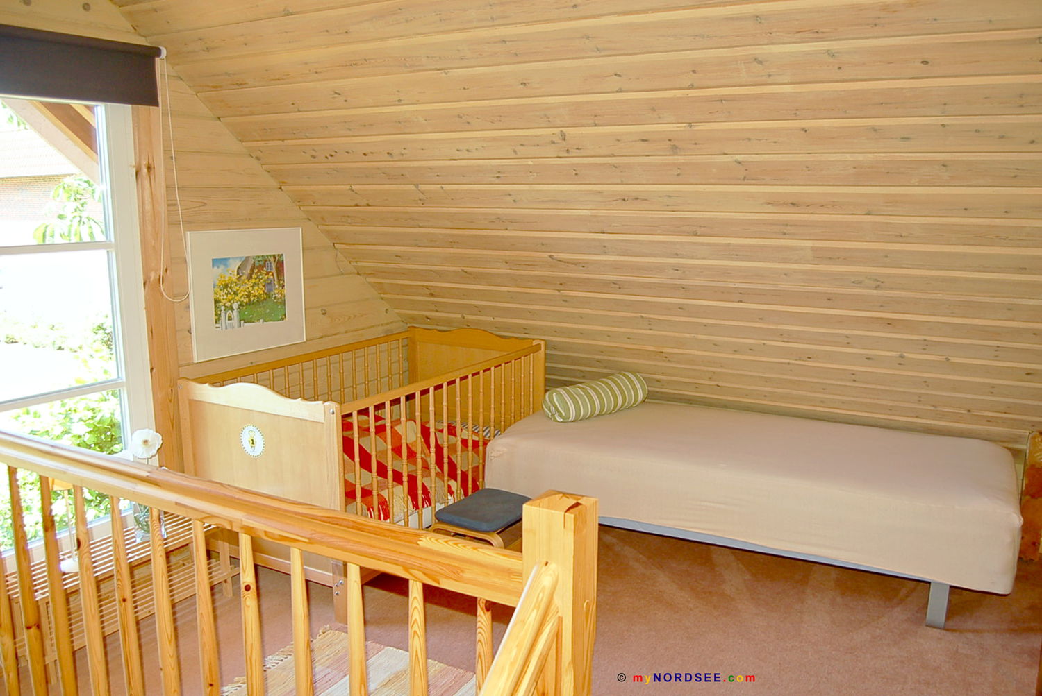 Couch, Beistelltisch, Stehlampe, Schreibtisch, Schreibtischstuhl, Tischlampe, TV-Rollregal, Sat-TV, Gallerie, Einzelbett, Kindergitterbett 120 x 0,70 m, Kleiderschrank, Treppe nach unten